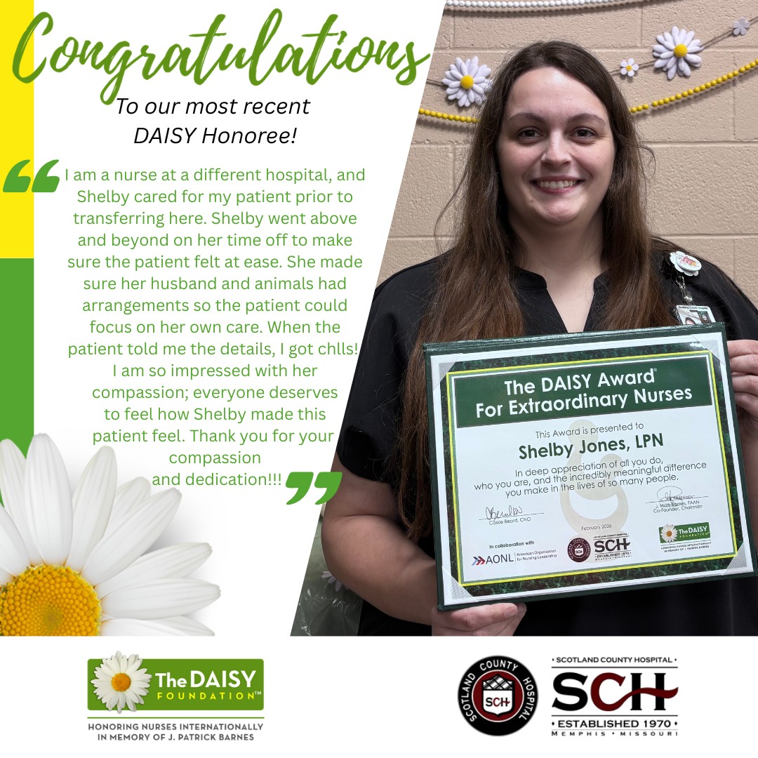 FOR IMMEDIATE RELEASE Shelby Jones, LPN, of Scotland County Hospital was recently honored with The DAISY Award® For Extraordinary Nurses. The award is…
